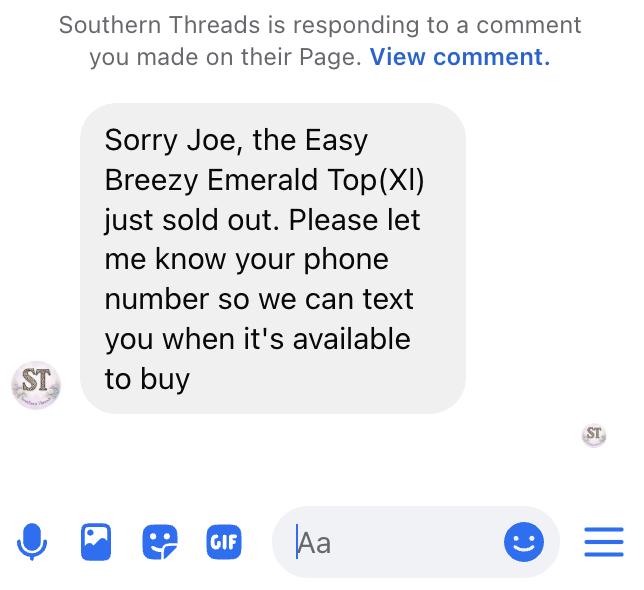 After your shopper comments for an item that's sold out, they'll get this message: